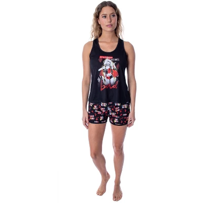 - FUN CHARACTER AND SAYING DESIGN – This 2 pc pajama set features a racerback muscle tank top and shorts. The top has a fun design of Harley Quinn wearing her classic black and red costume and the saying; It’s Good To Be Bad! The booty shorts feature a great allover pattern of multiple sayings like Love Stinks, Puddin, and other character-themed designs. Let’s face it; bad girls are the best!