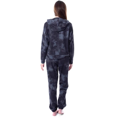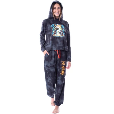 - SHORTENED HOODIE STYLE – The pants also have an extra-long waist tie on the pants (so you won’t lose it in the wash) that matches the color of the Def Leppard logo. This hooded jogger PJ set is both comfortable and functional, it is made of a polyester-spandex blend that allows it to wear well but also be stretchy and comfortable. The top has a shortened oversized hoodie look with an extra soft hood and the pants are joggers with two extra deep pockets hidden in the seam to carry your phone or keys. Any fan of Def Leppard will love relaxing in this fun set