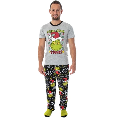 Dr.Seuss and the classic story, How The Grinch Stole Christmas, started as an inspiring children’s tale and is now one of the most beloved holidays shows around! This pajama gift set comes with a Grinch character ringer t-shirt sleep top and matching microfleece pants & cozy socks! The tee is 60% cotton/40% polyester and features a high-quality printed design on the front of the Grinch wearing a Santa hat and the saying Stink, Stank, Stunk! The pajama pants are a soft fleece fabric with a cool allover Naughty design. The socks are a super fluffy fabric that is synonymous with the words cozy socks!.