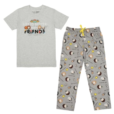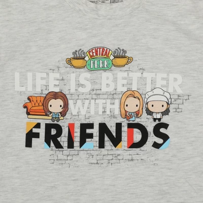 Celebrate the gift of friendship with this Friends TV sleep set. The set includes an athletic heather graphic tee with chibi images of the Friends characters surrounded by icons like the Central Perk cafe logo and the pivot couch and a pair of gray stretch pants with chibi images of all your favorite characters from the show. Fans of the Friends sitcom will love this comfy and cozy sleep set.