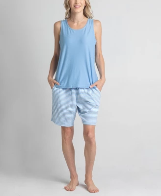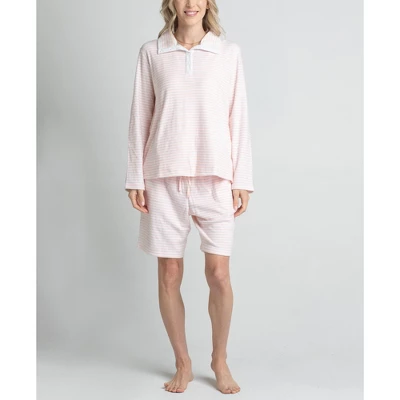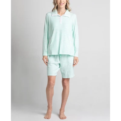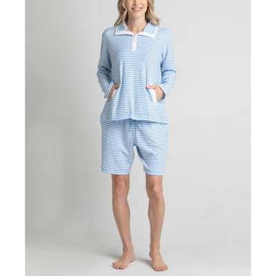 A 3-piece lounge set featuring a lightweight knit tank, a soft terry bermuda short and a mock neck top. Machine wash/Tumble dry.