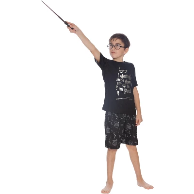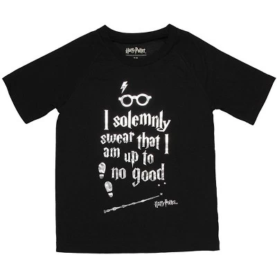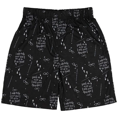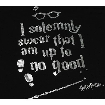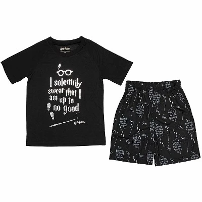 This is a set that is a must for that Harry Potter fan in your family. Fun 2 piece set with short bottoms and short sleeve top. Lightweight fabric for a comfortable feel. Black 100% Polyester bottoms with an allover “Up to no Good” print and a the top that features the text ” I solemnly swear that I am up to no good” written in a silver foil. For questions regarding sizing, please refer to size chart.