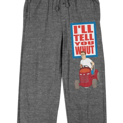 - CUSTOM DESIGN: Hank Hill drives a lawnmower under red letters that spell out, “I’ll Tell You What,” on these sleep pajama pants. Fans of the King of the Hill animated sitcom will love this fun custom design.