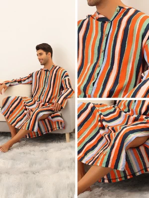 The nightgown is made of cotton frabic, which is soft, lightweight and breathable. This nightgown features colorful stripes, long sleeves, a henley collar, front buttons, and reaches ankle length. Available in many different colors and sizes. This striped nightgown is suitable for daily wear, hanging out at home, indoor, beach, theme party, vacation and so on.