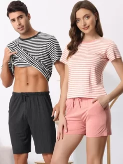 Cheibear Men’s Sleepwear Short Sleeve T-Shirt With Shorts Stripe Couple Pajama Sets