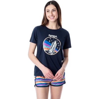 - CLASSIC CHARACTER DESIGN – This pajama-top features a retro look of the NASA logo and a rocket amidst the stars. The shorts are a striped orange, yellow, blue, and purple.