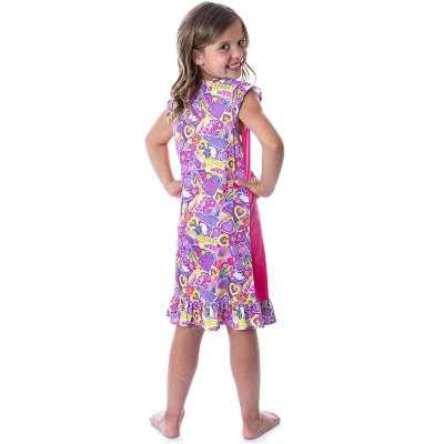 - RUFFLE SLEEVE CAPS / VIVID COLOR PATTERN – This Polly Pocket nightgown features a front design with the Polly Pocket and her 2 friends sitting on a cupcake, saying, “Tiny is Mighty.” The ruffle sleeves, ruffle hem, and back all have a wonderful allover pattern of multiple Polly Pocket-related sayings and designs.