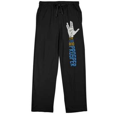 - GRAPHIC TEE: A hand spreads its fingers out in a Vulcan salute on the left leg of these sleep pants while blue and yellow text below reads, “live long and prosper.” Fans of the Star Trek TV series will love this design.