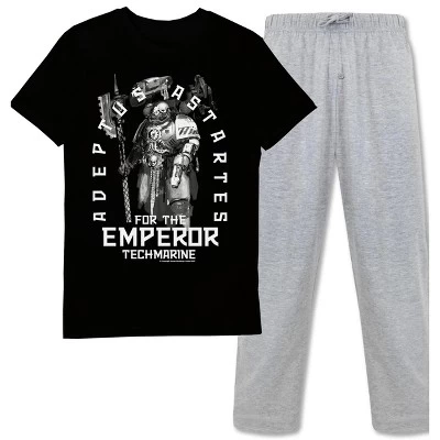 - GRAPHIC TEE: A black and white image of a pace marine stands in the center of this graphic tee while white letters read, “Adeptus Astartes, For the Emperor Techmarine.” Warhammer fans will love this comfy lounge set.