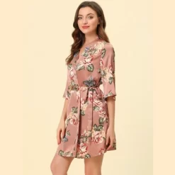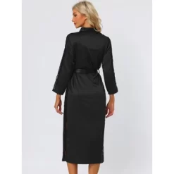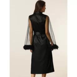 Cheibear Women’s Satin Robe Feather Trim Bridesmaid Bathrobe Mesh Long Sleeve Bridal Party Sleepwear