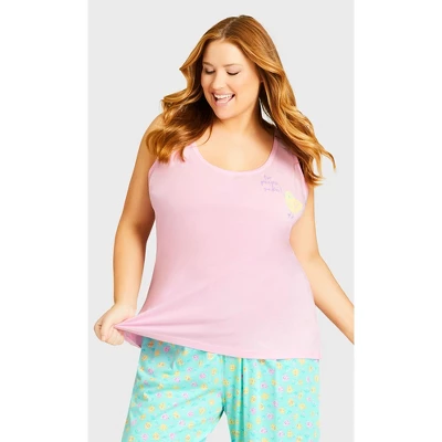 Be the sweetest spring chick around in the Chicks Sleep Top! Featuring a soft pink hue and cheeky ‘for peeps sake!’ graphic, a breezy relaxed fit, and a soft stretch embrace will have you dreaming in comfort and style. Complement with a printed sleep pant and satin eye mask.Avenue is a leading plus size brand specializing in the perfect fit for sizes 12 – 32